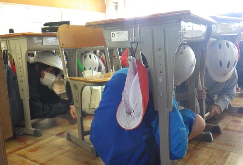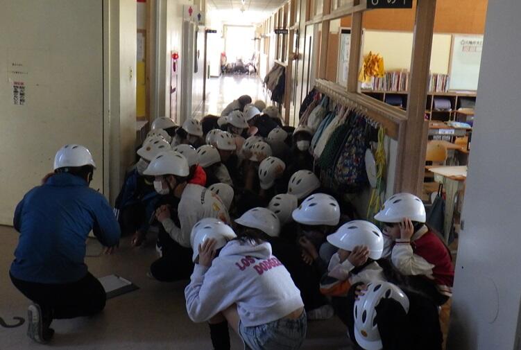 4月22日、2時間目に地震発生を想定した避難訓練を行いました。今回は、本震がおさまり、避難している途中(廊下や階段で移動中)で余震が発生した場合の避難の仕方について学ぶことを主な目的として行いました。